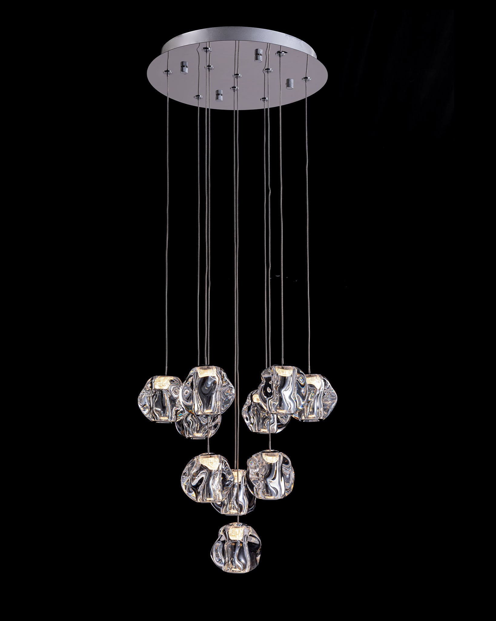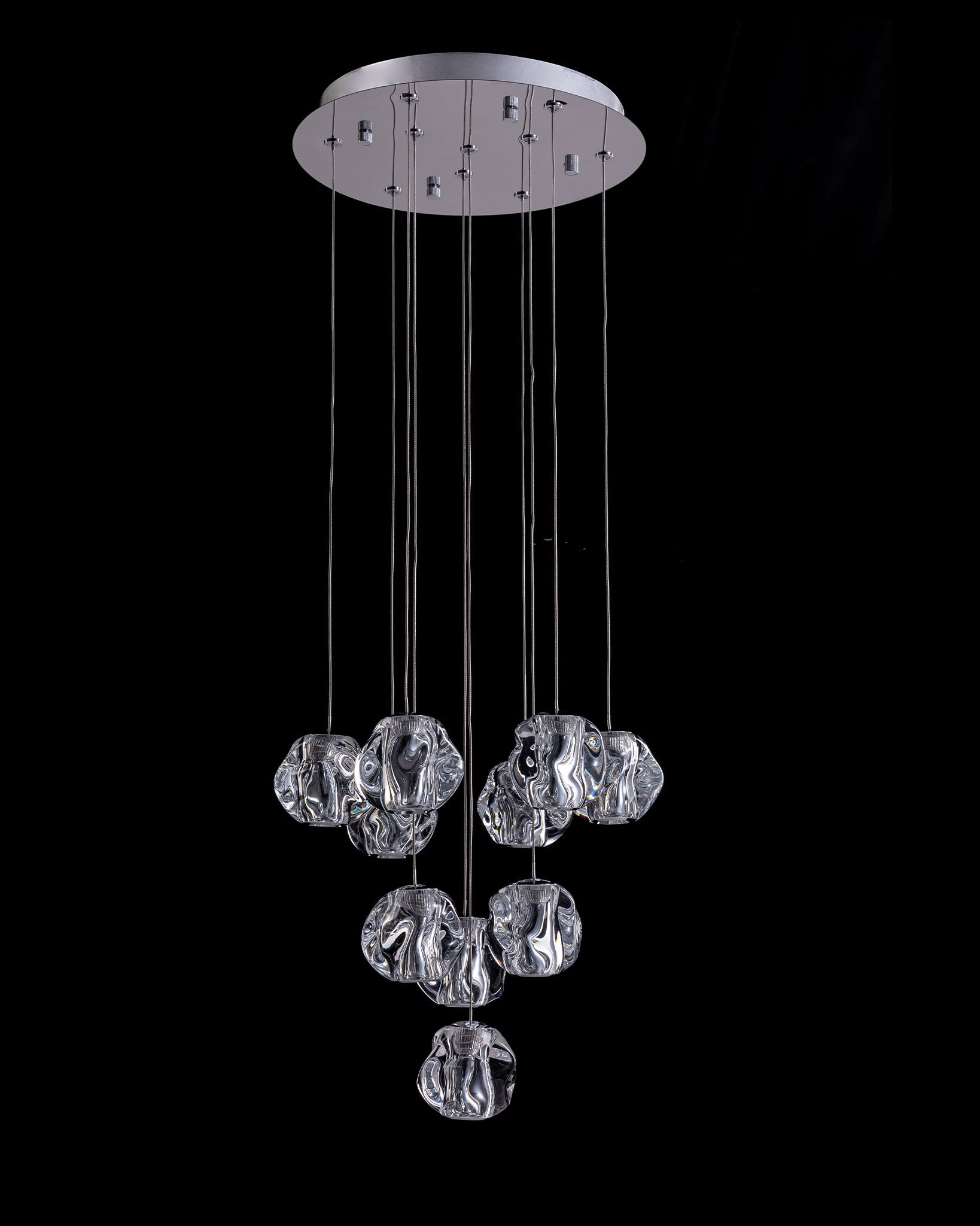 Ciottolo 10 Light Chrome LED Pendant features a circular design Ceiling plate and holding 10 organic globe shaped shades with down lights.