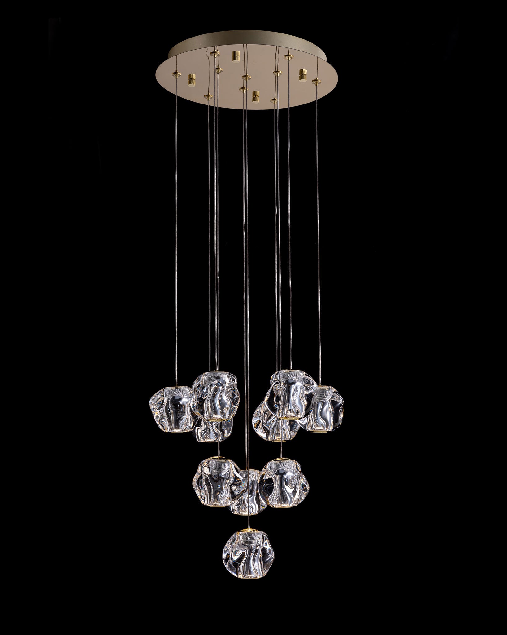Ciottolo 10 Light Satin Gold LED Pendant features a circular design Ceiling plate and holding 10 organic globe shaped shades with down lights.
