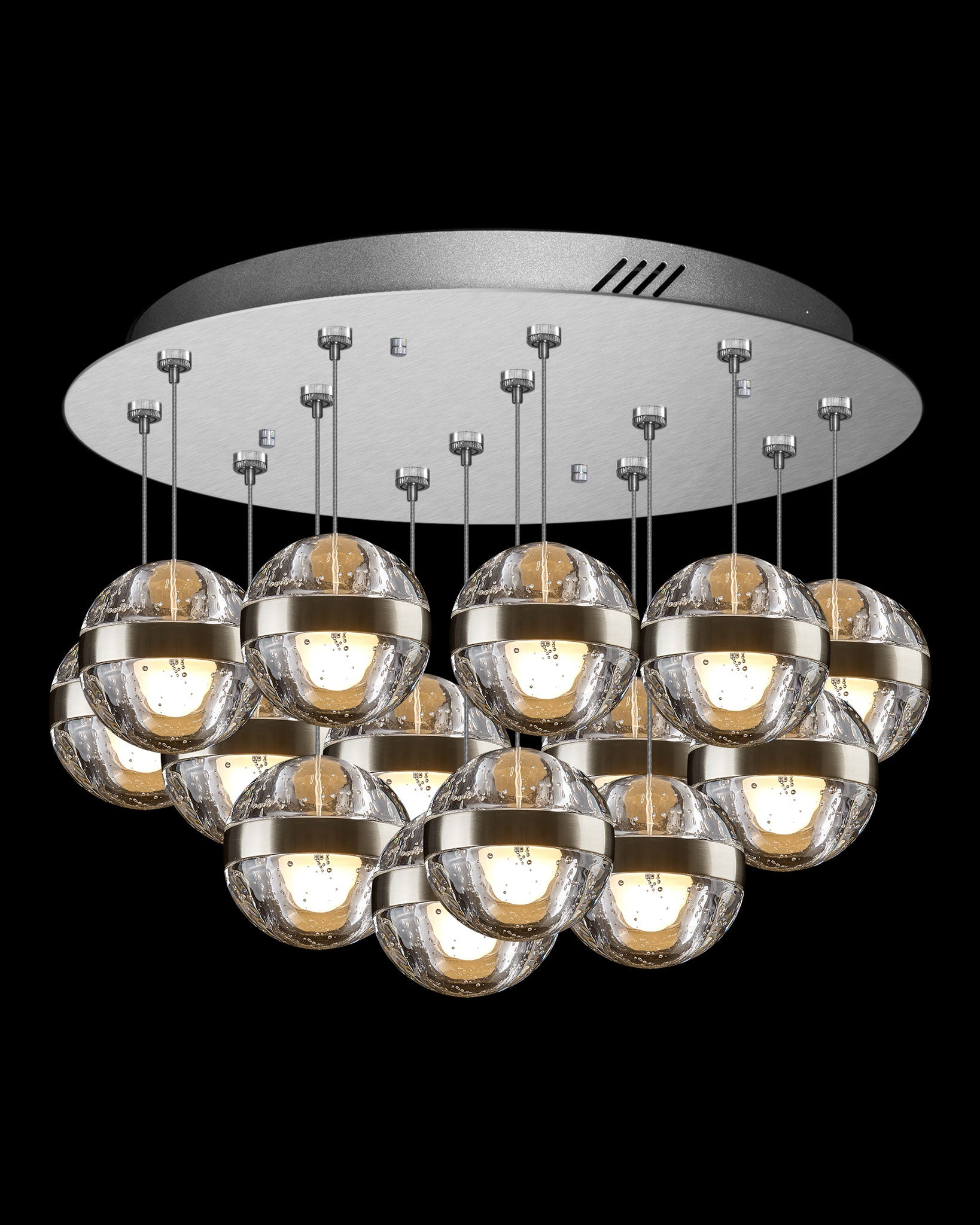 Frizzante 14 Light Satin Nickel with Clear Bubble Glass LED Pendant, features a circular design ceiling plate and holding 14 Bubble glass shades.