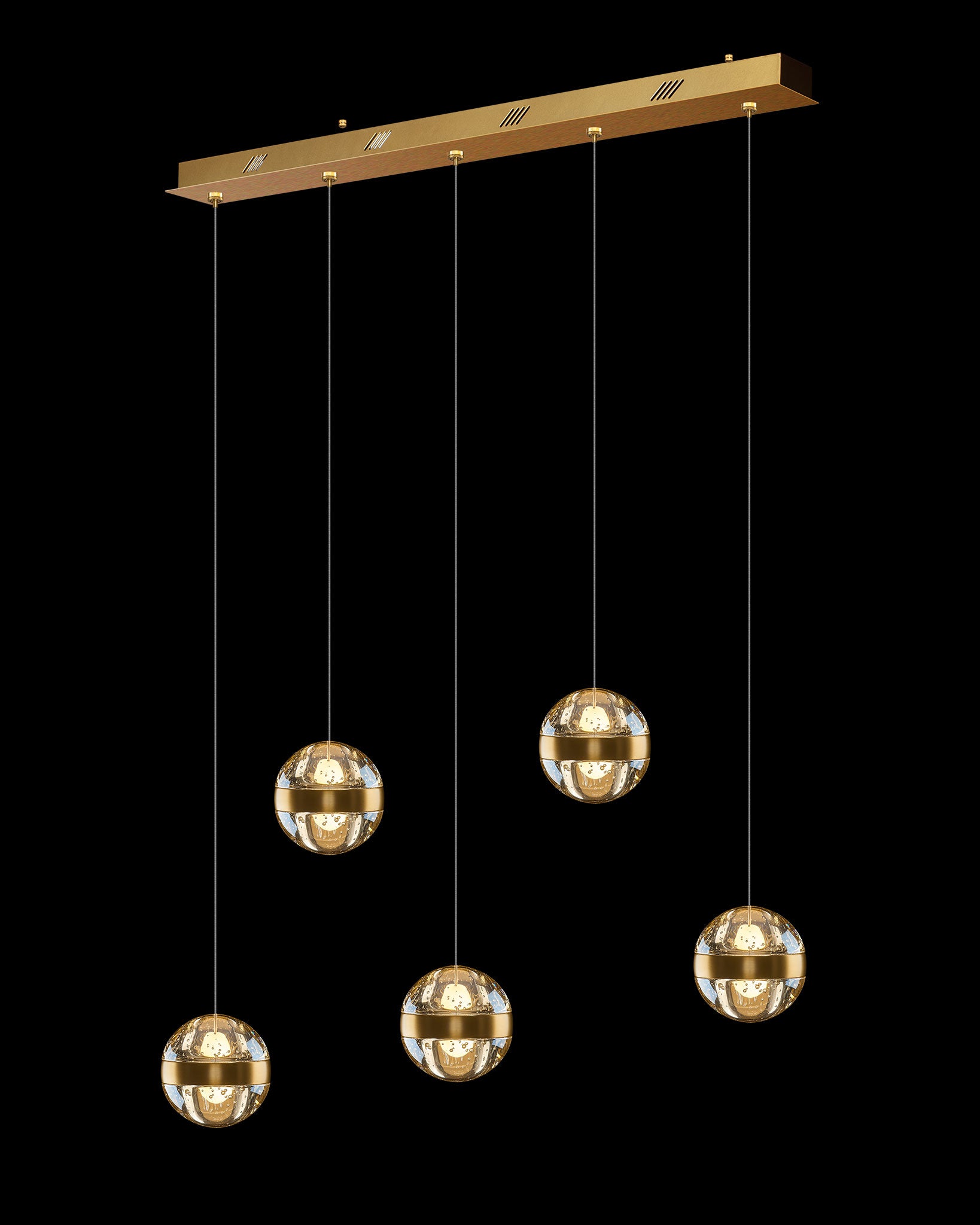 Frizzante 5 Light Bar Satin Gold with Champagne Bubble Glass LED Pendant, features a long ceiling plate and holding 5 Bubble glass shades.