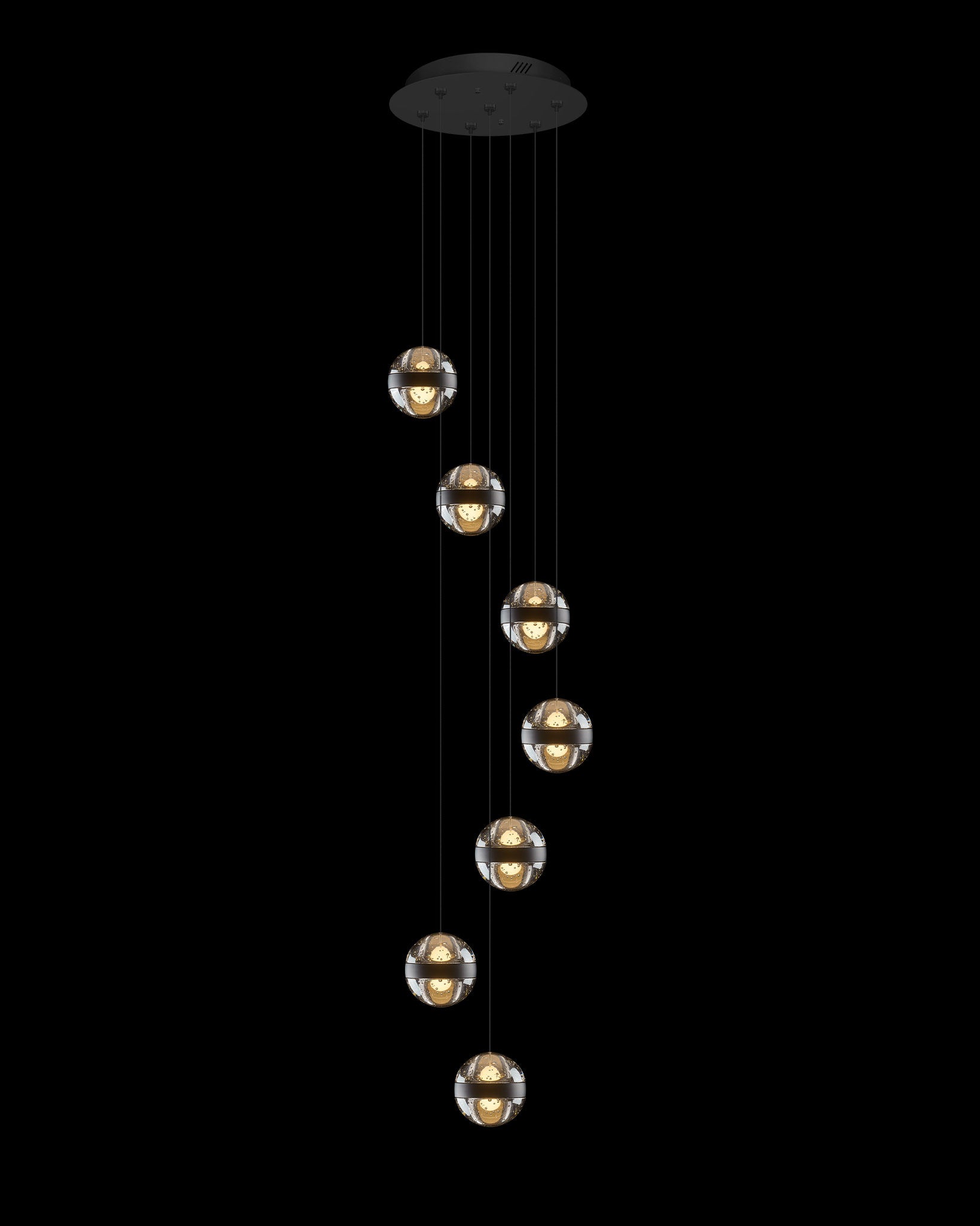 Frizzante 7 Light Matt Black with Black Smoked Bubble Glass LED Pendant, features a circular design ceiling plate and holding 7 Bubble glass shades.