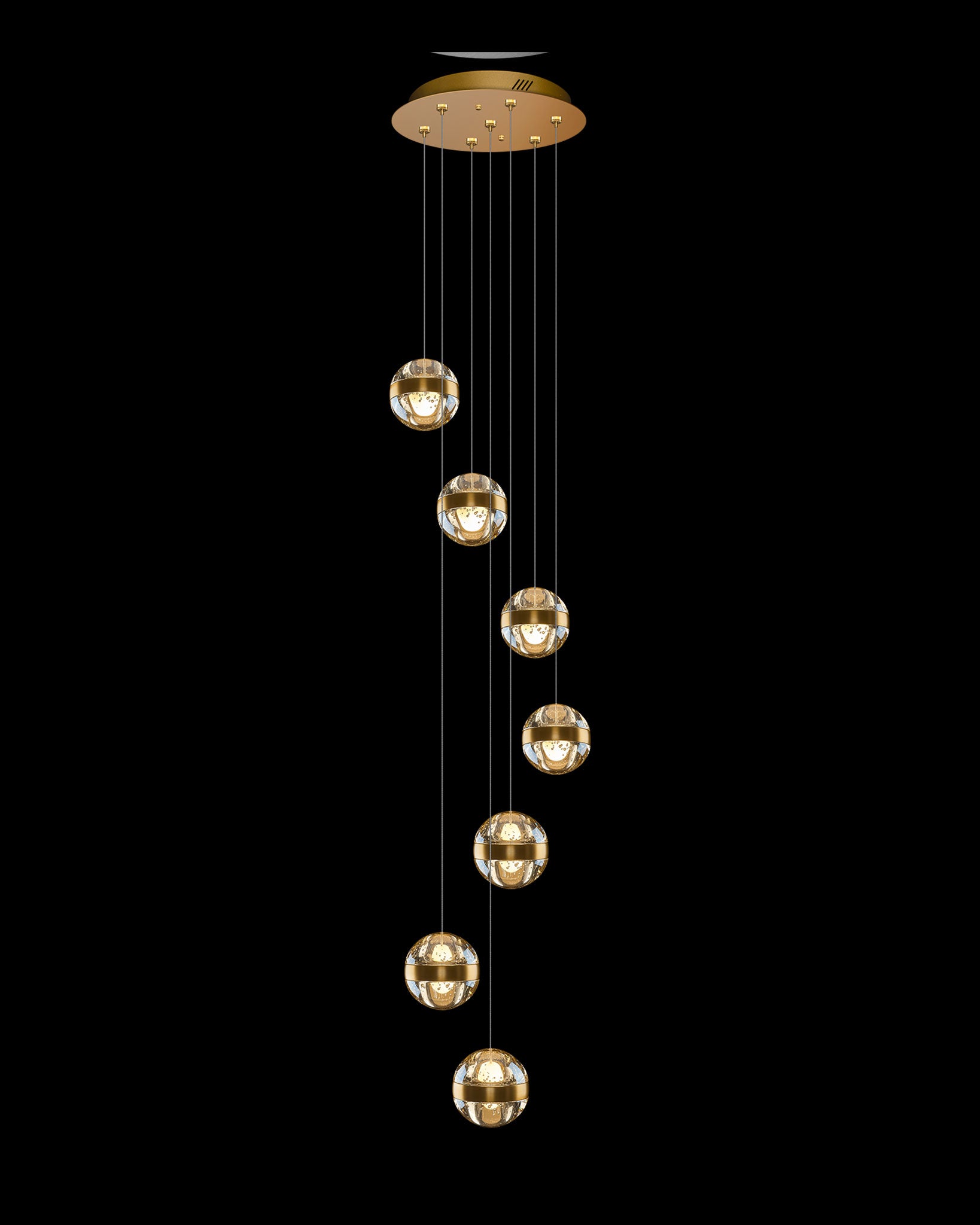 Frizzante 7 Light Satin Gold with Champagne Bubble Glass LED Pendant, features a circular design ceiling plate and holding 7 Bubble glass shades.